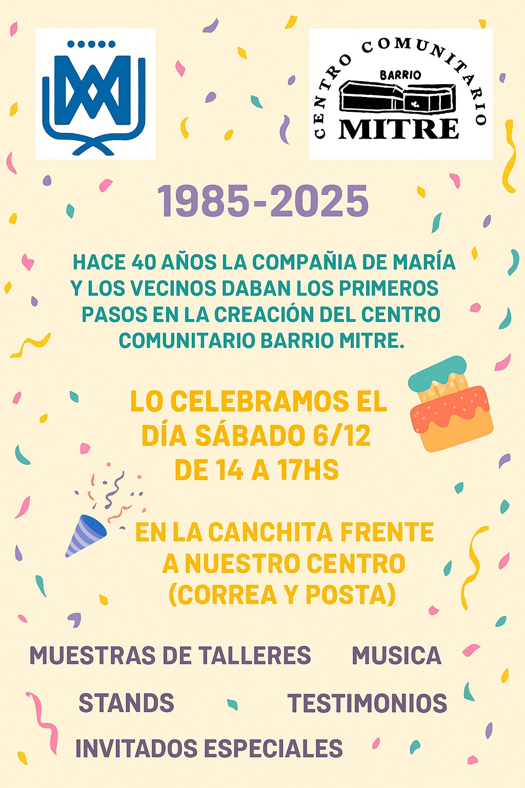 En la organización del evento adelantan que habrá talleres, música, puestos e invitados especiales. “Hace 40 años la Compañía de María y los vecinos daban los primeros pasos en la creación del Centro Comuntario Barrio Mitre”, destacaron.