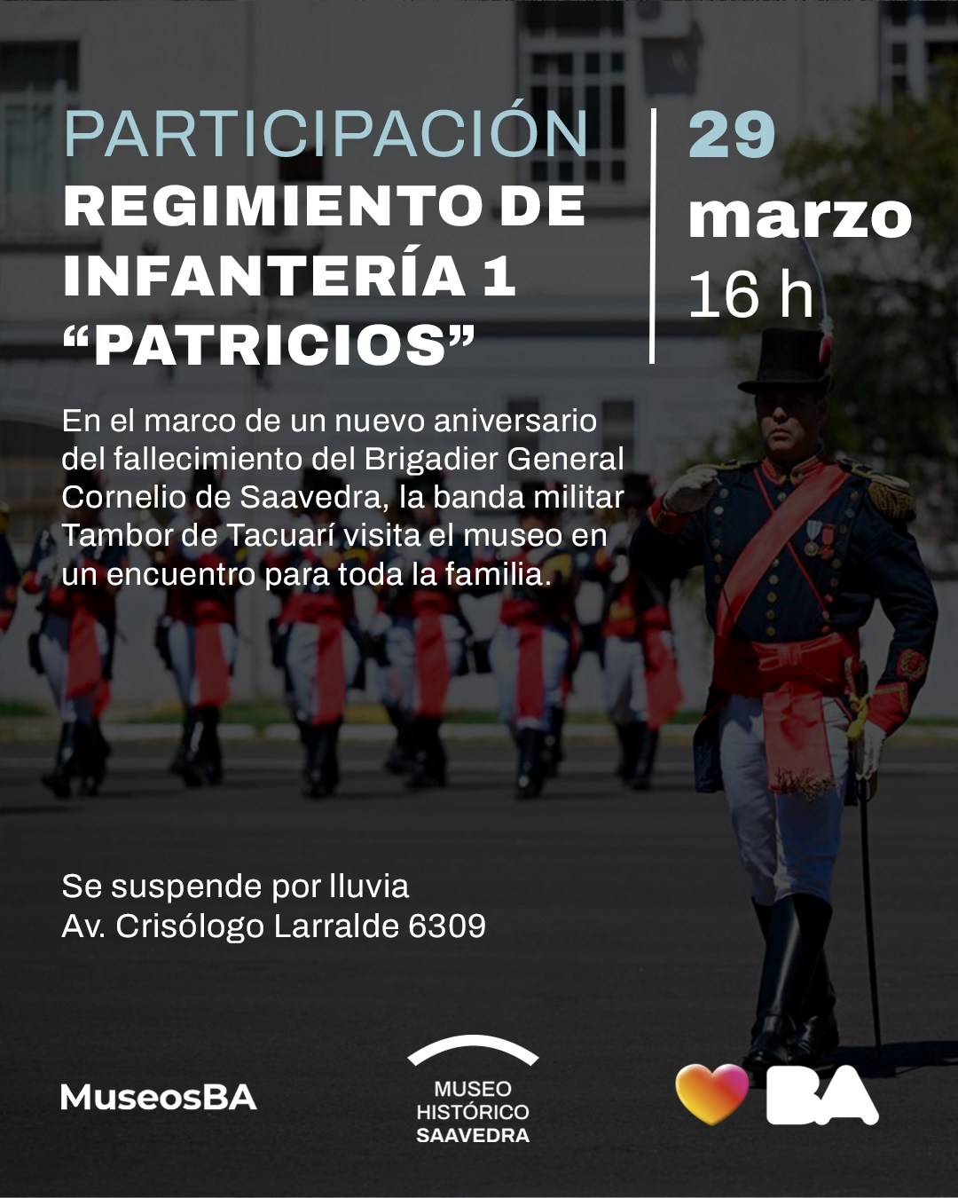 En el marco de un nuevo aniversario del fallecimiento del Brigadier General Cornelio Saavedra (15 de septiembre de 1759-29 de marzo de 1829), el Museo Histórico Cornelio de Saavedra (Crisólogo Larralde 6309) recibirá al Regimiento de Infantería 1 “Patricios” para celebrar el domingo 29 de marzo a las 16 una jornada de música y recordación en sus jardines. La actividad está incluida en la entrada.