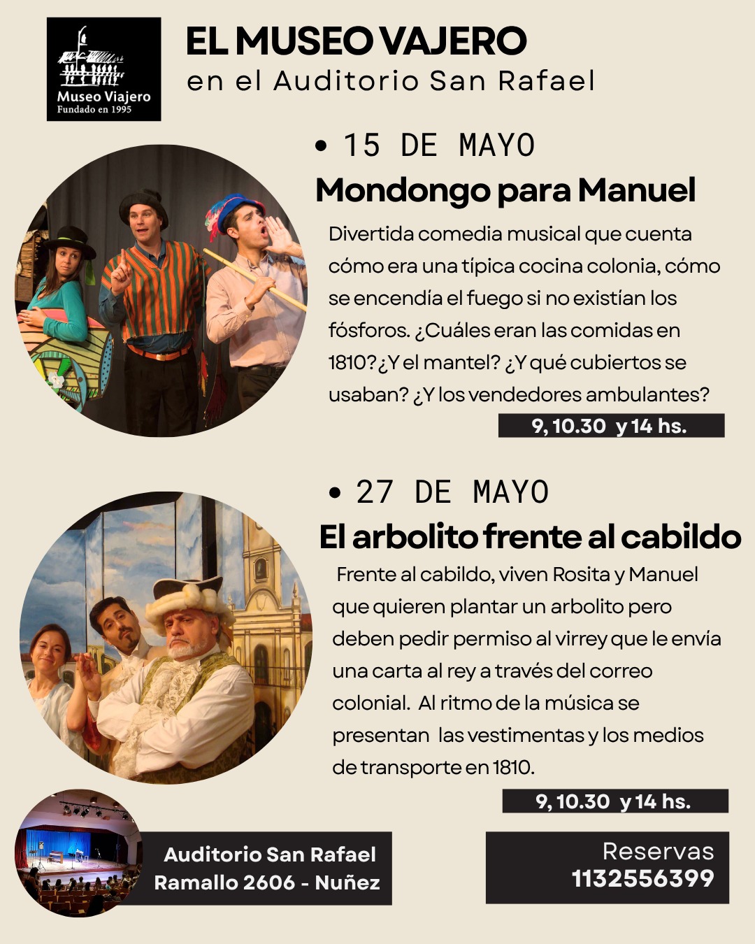 El Museo Viajero ofrecerá nuevas funciones de sus comedias musicales dirigidas al público escolar en Saavedra, con actividades programadas para el mes de mayo. Las presentaciones se realizarán en el Auditorio San Rafael (Ramallo 2606). Es un regreso al barrio tras su salida en 2023 del museo histórico local.