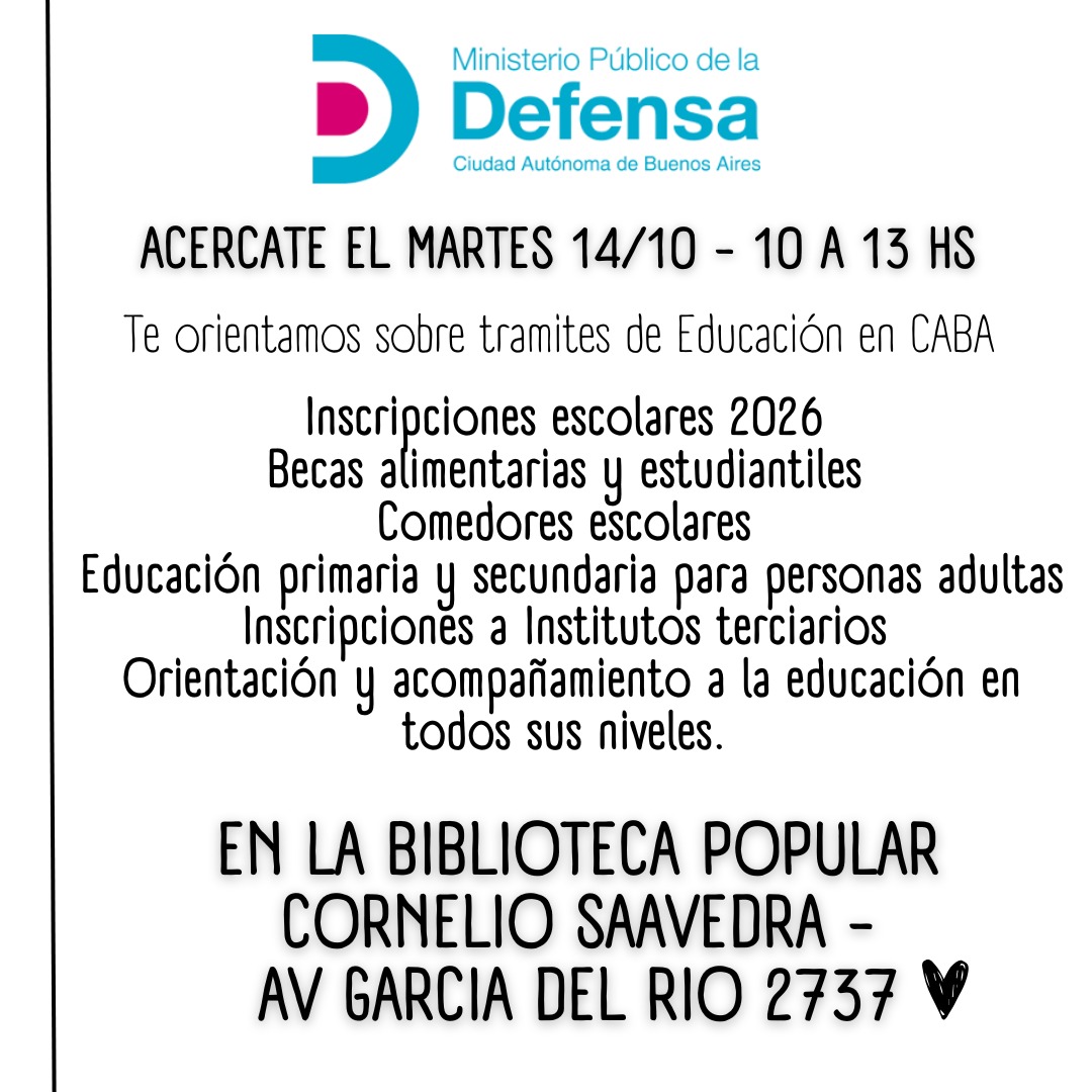 El Ministerio Público de la Defensa de la Ciudad de Buenos Aires montará oficinas móviles y asesorará a vecinos este martes 14 de octubre de 10 a 13 en la Biblioteca Popular Cornelio Saavedra (García del Río 2737).