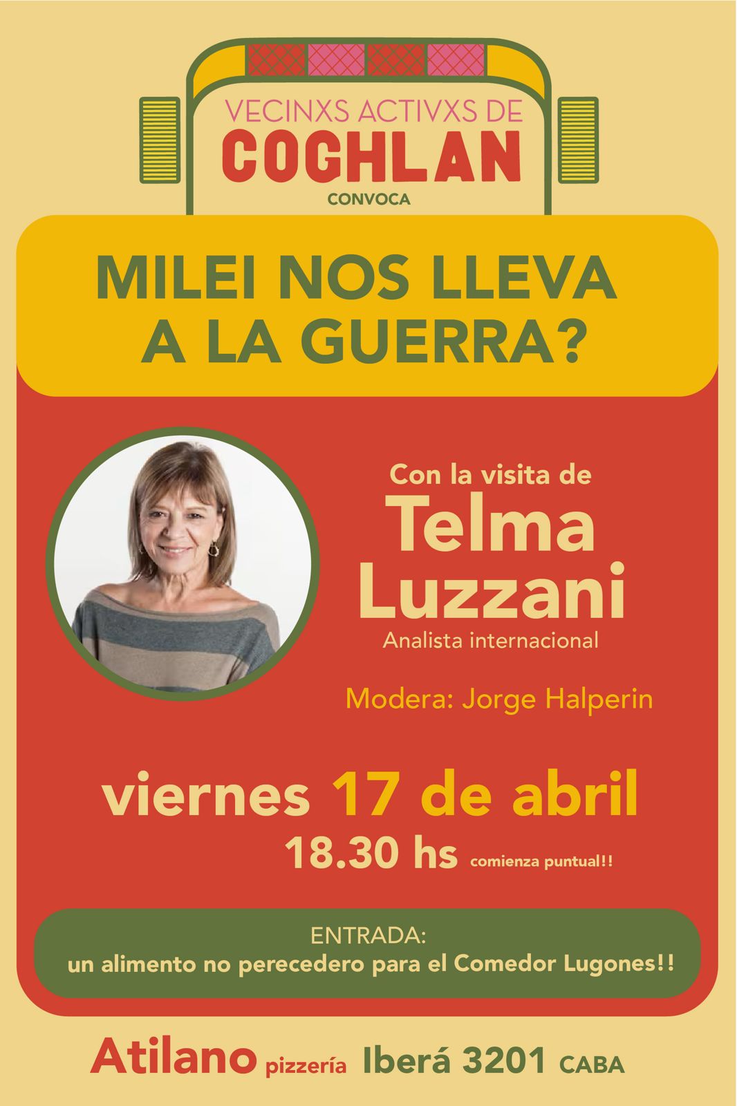 El colectivo barrial Vecinos Activos de Coghlan organiza una charla abierta titulada “¿Milei nos lleva a la guerra?”, que se realizará el próximo viernes 17 de abril a las 18.30 en la pizzería Atilano (Iberá 3201).